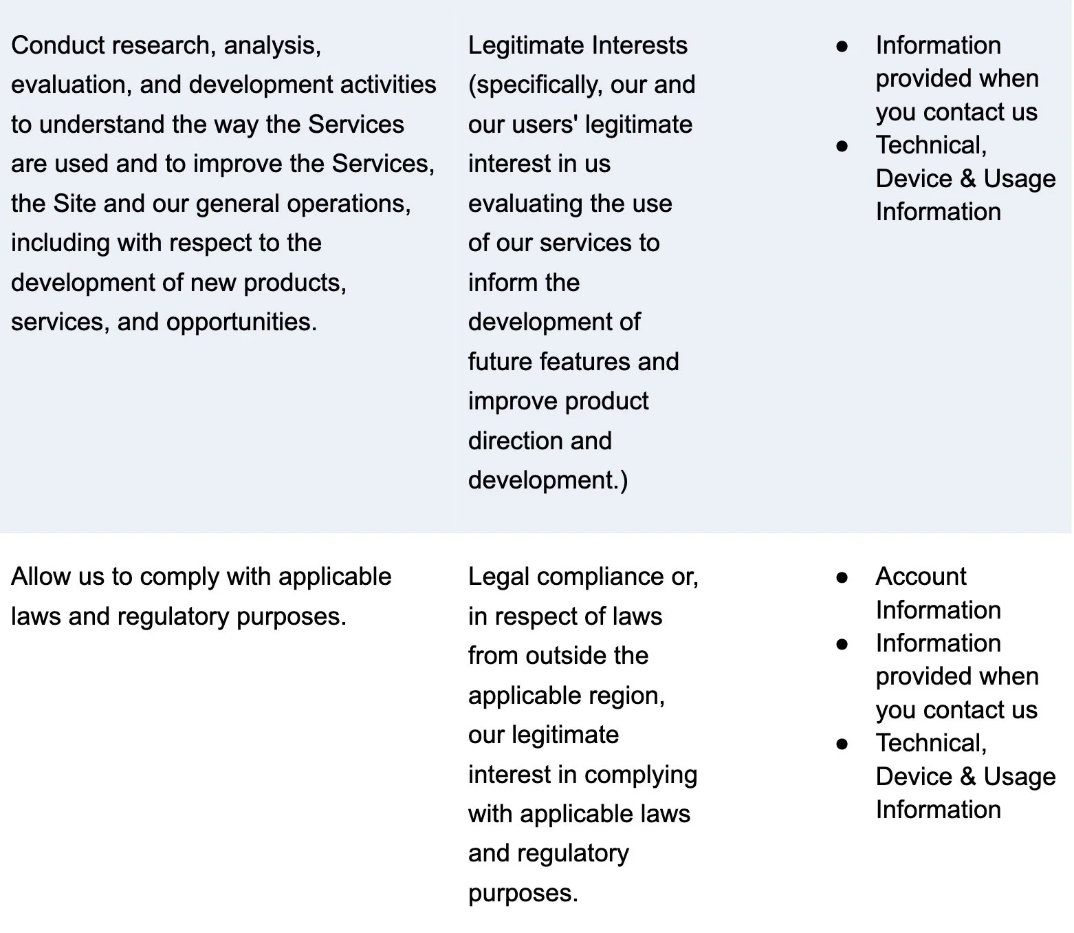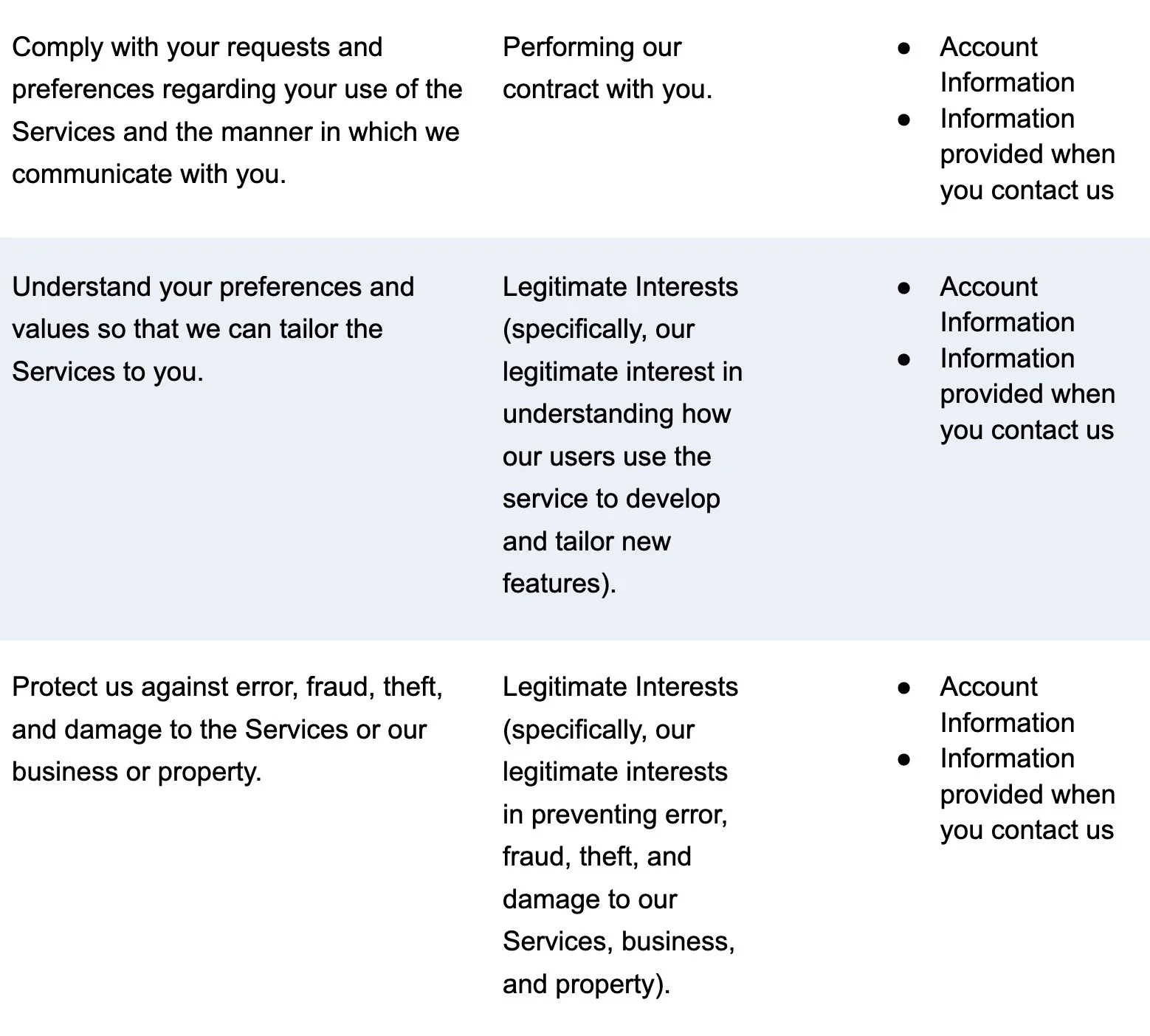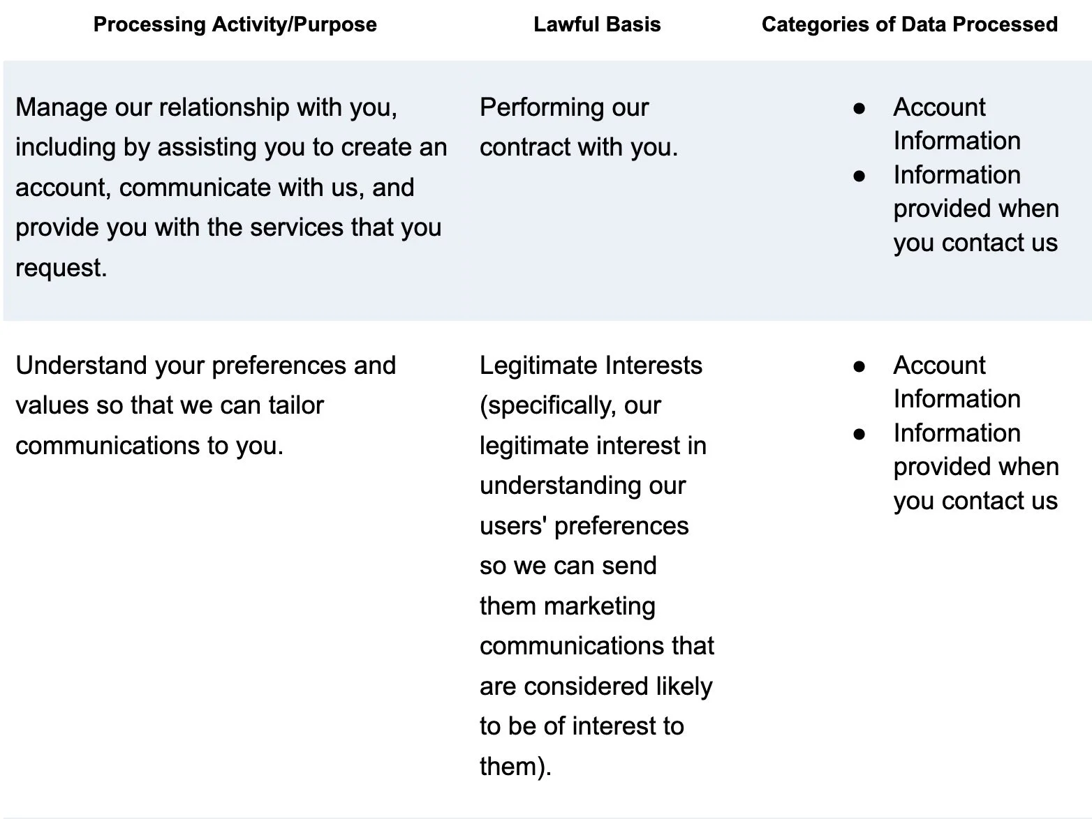 We describe below the purposes of our processing (why we process your information) and our processing operations (how we process your information to achieve each purpose). We also list the categories of your information that we process for each purpose and the legal basis we rely upon to do so.
