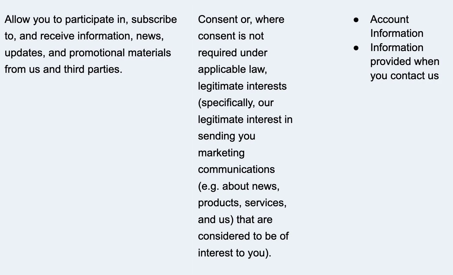 allowing you to participate in, subscribe to, and receive information, news, updates, and promotional marketing materials from us and third parties;